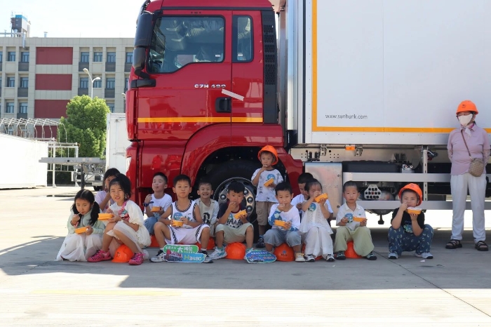 中置轴冷藏车冷机开启,车内准备好的冷饮和矿泉水让大小朋友直呼“好凉快!”,尾板升降、车辆链接等演示更是引来阵阵掌声