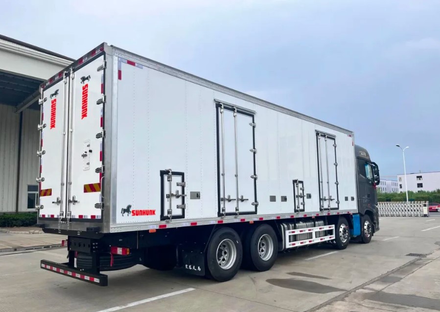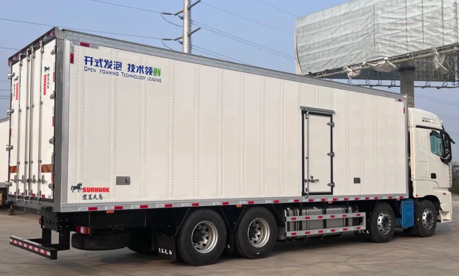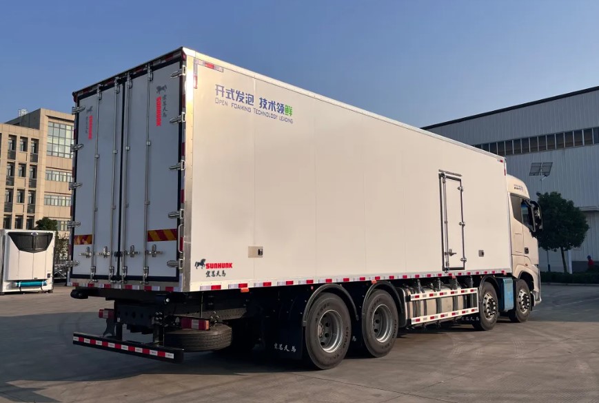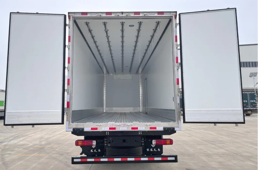 挂肉结构采用铝合金导轨和不锈钢挂钩,外蒙皮采用铆接工艺,箱板内部采用钢骨架承载结构,提升整体承载力和密封性