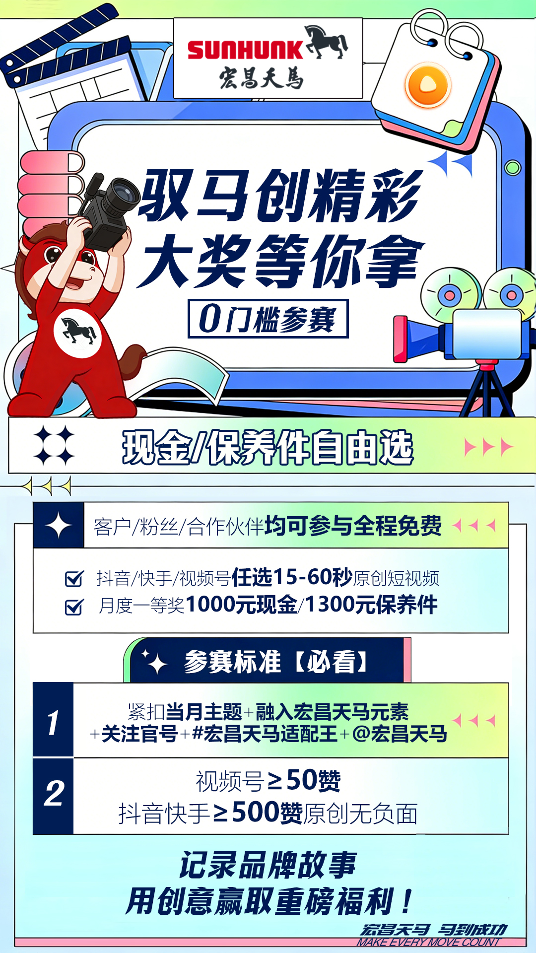 2026宏昌天马「全员创客・聚力传播」年度共创计划——外部用户月度视频主题大赛正式启动!以镜头记录品牌故事,用创意解锁专属福利,现金奖励、品牌定制保养件随心选,月度主题精准适配不同创作视角,零门槛参与、高曝光加持,邀你一起驭马而行,用创意为宏昌天马打call,赢取丰厚大奖!