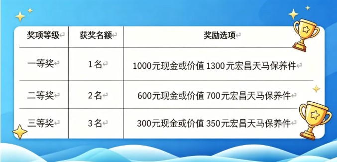 2.官方免费推广:获奖作品将在宏昌天马抖音、快手、视频号、公众号等官方全平台转发推广,全程注明创作者信息,让你的创意被更多人看见;