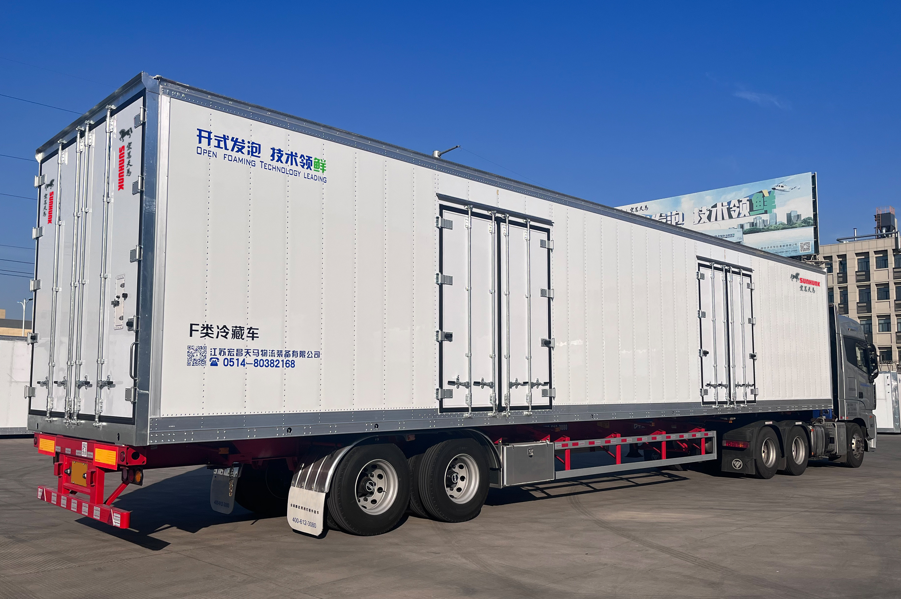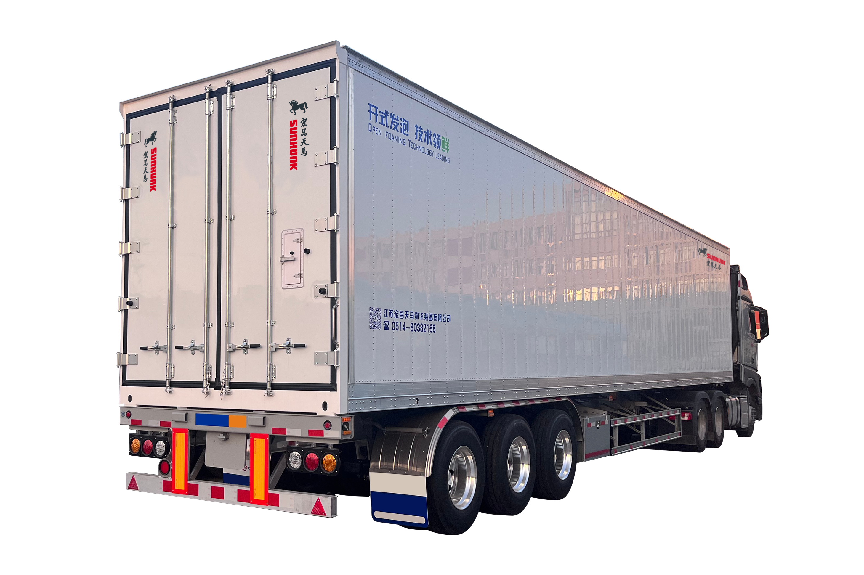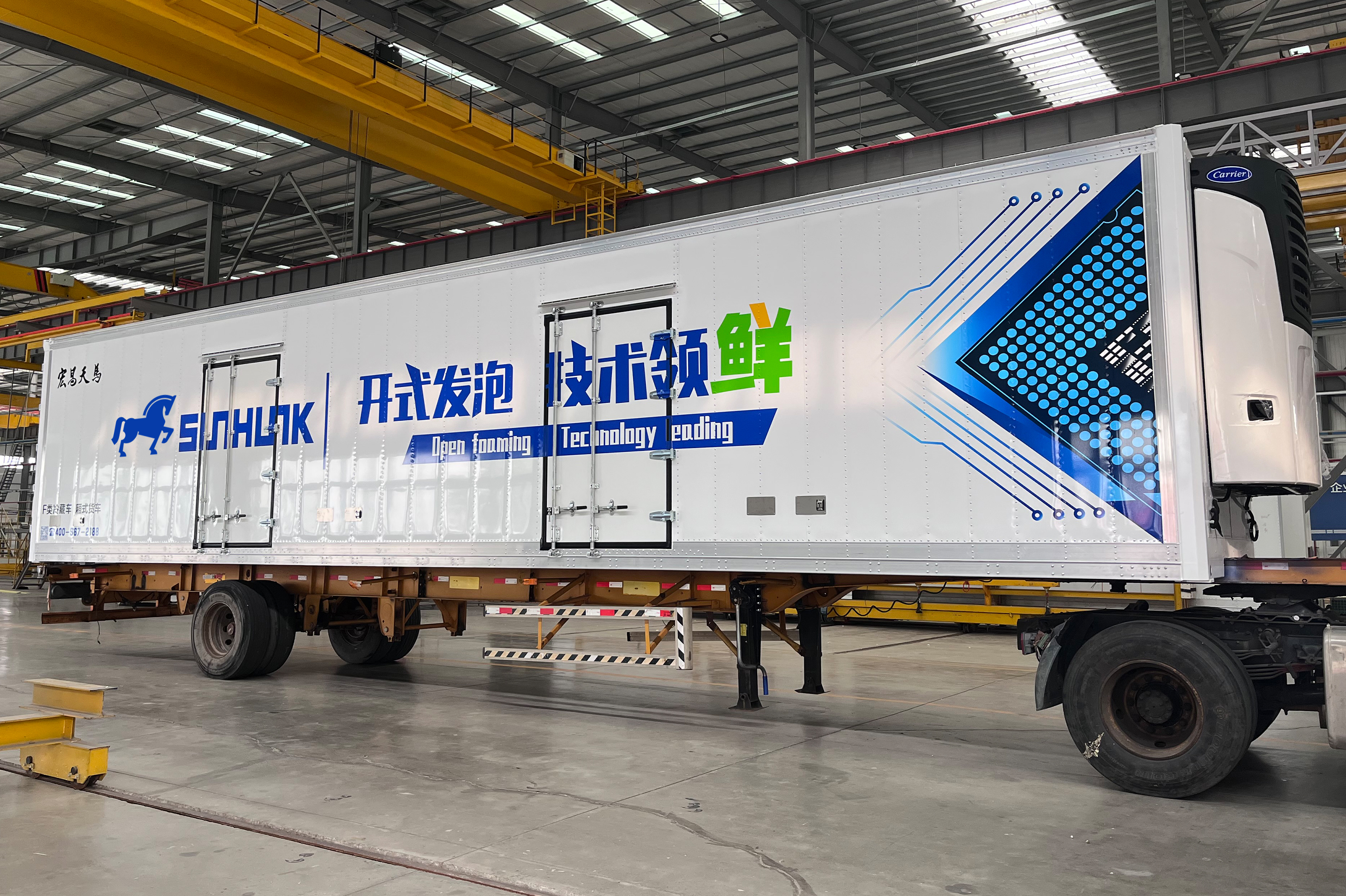 厢体结构采用铆接工艺,厢板内部采用钢骨架承载结构,抗拉强度高,地板采用T6级别高强铝导轨满焊工艺,提升整体承载力,更加符合国内工况要求;