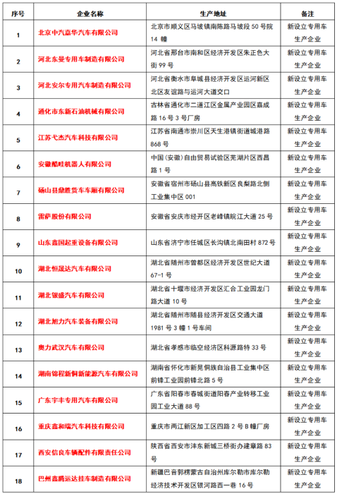 根据公示的内容,第370批公告拟新增专用汽车生产企业共18家。本次拟新增的专用车生产企业涉及范围较广,分布国内12个省市自治区。湖北省4家,分别为随州2家、十堰1家、孝感1家;安徽省3家,芜湖、宿州和安庆各1家;河北省2家,衡水和邢台各1家;北京1家;吉林通化1家;江苏南通1家;山东济宁1家;湖南怀化1家;广东阳春1家;重庆1家;陕西西安1家;新疆库尔勒1家。