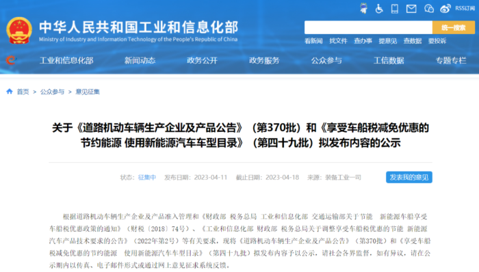 2023年4月11日,工信部装备工业一司在其官网上公示了第370批《道路机动车辆生产企业及产品公告》(以下简称公告)拟新增车辆生产企业名单,公示时间为2023年4月12日—2023年4月18日。